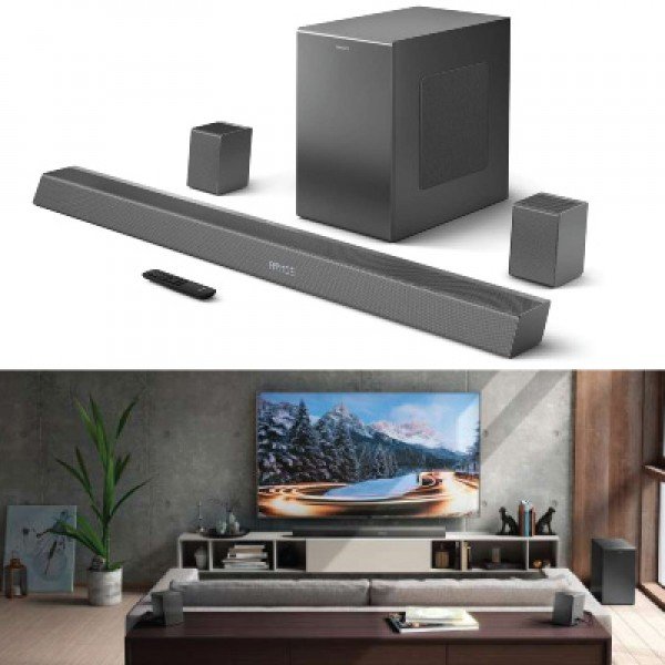The sleek, metallic design of the Philips TAB8967. It includes a wireless subwoofer, an external soundbar that can be mounted on the wall, and remote controls. The sound system of the audio device is made up of three front-firing, two backwards, and two upward speakers. Additionally, there is an 8-inch subwoofer. The gadget has a 780W dynamic sound output capability. The soundbar is compatible with both Dolby Digital Plus and Atmos. This makes it possible to create a 360-degree surround sound effect, which improves the overall viewing experience.